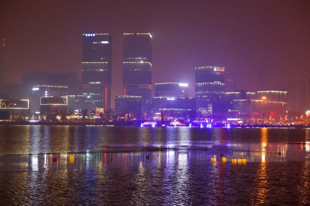 天府新区兴隆湖沿岸彩灯映红