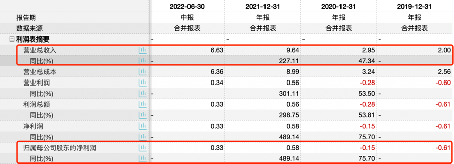 2019年-2021年以及2022年上半年,富特科技的营业总收入分别为2亿元、2.95亿元、9.64亿元以及6.63亿元,其中2020年和2021年的同比增长率分别为47.34%和227.11%;同期归母净利润分别为-0.61亿元、-0.15亿元、0.58亿元和0.33亿元,其中2020年和2021年的同比增长率分别为75.7%和489.14%。