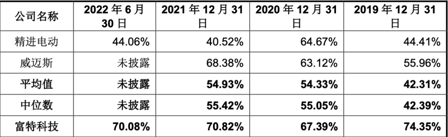 此外,富特科技还存在资产负债率较高的情况。招股书显示,2019年-2021年以及2022年上半年,富特科技总负债金额分别为2.29亿元、3.40亿元、8.35亿元和9.11亿元,资产负债率分别为74.35%、67.39%、70.82%和70.08%。而2019年-2021年欣锐科技、英搏尔以及精进电动等同行可比公司的资产负债率均值分别为42.31%、54.33%和54.93%,相较之下,富特科技的负债率水平偏高。