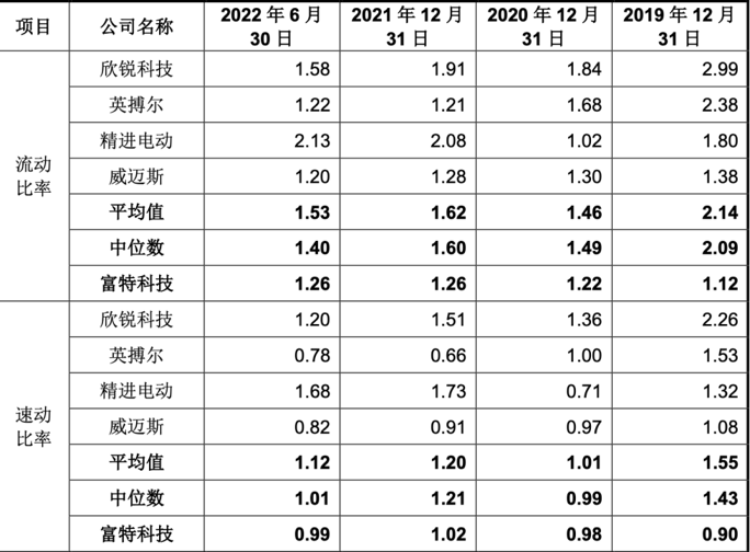 富特科技负债规模较大,且偿债能力比较弱。2019年-2021年以及2022年上半年,富特科技的流动比率分别为1.12倍、1.22倍、1.26倍以及1.26倍;速动比率分别为0.90倍、0.98倍、1.02倍以及0.99倍。同行可比公司的流动比率均值为2.14倍、1.46倍、1.62倍以及1.53倍;速动比率均值分别为1.55倍、1.01倍、1.20倍以及1.12倍。相比之下,富特科技流动比率、速动比率较低。