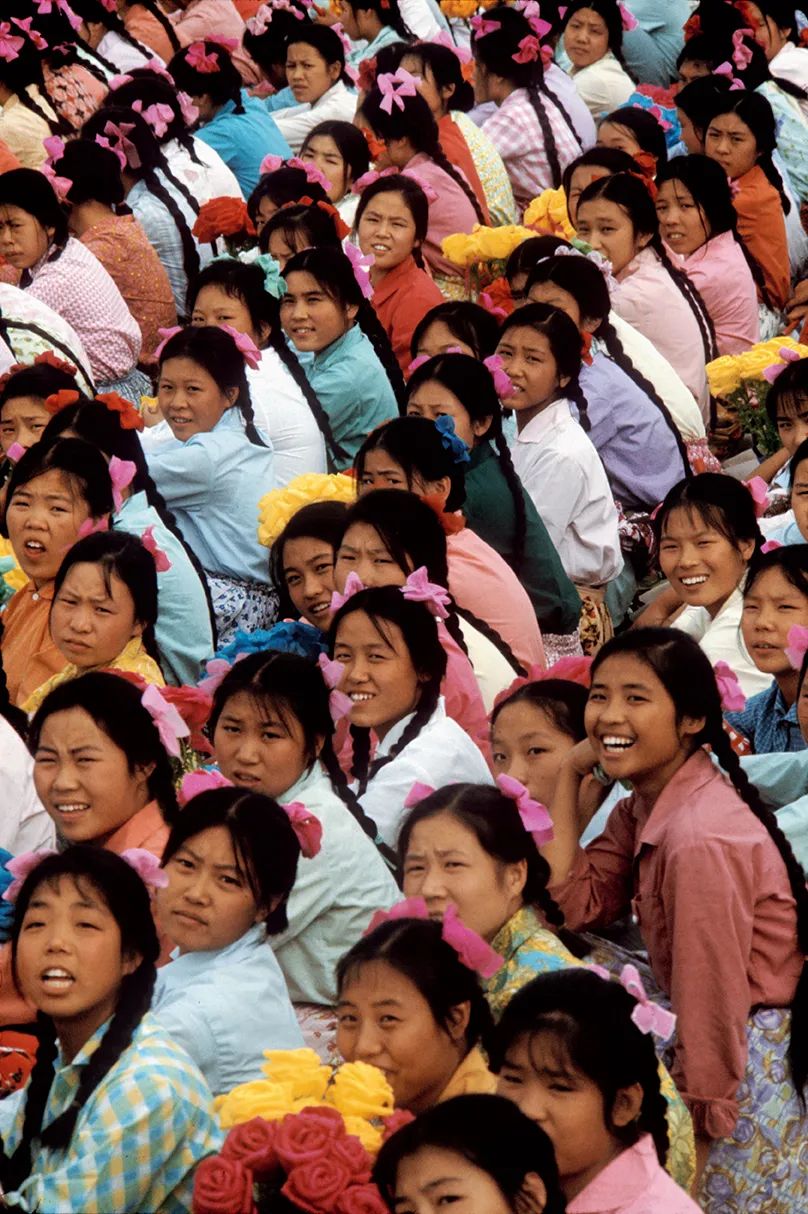 在天安门广场前面,一队戴着少先队红领巾、穿着白衬衫的小礼仪队走过,她们花花绿绿的裙子显然是临时定制的,不同于那个时代中国铺天盖地的深蓝和军绿。这些小姑娘边走边转过头来,好奇地盯着正在拍照的法国摄影师布鲁诺·巴贝,成为留在镜头里的直视他的主体的目光,这种目光也在他的一些其他画面中出现。他经常捕捉这种不设防的、目光交会的瞬间。