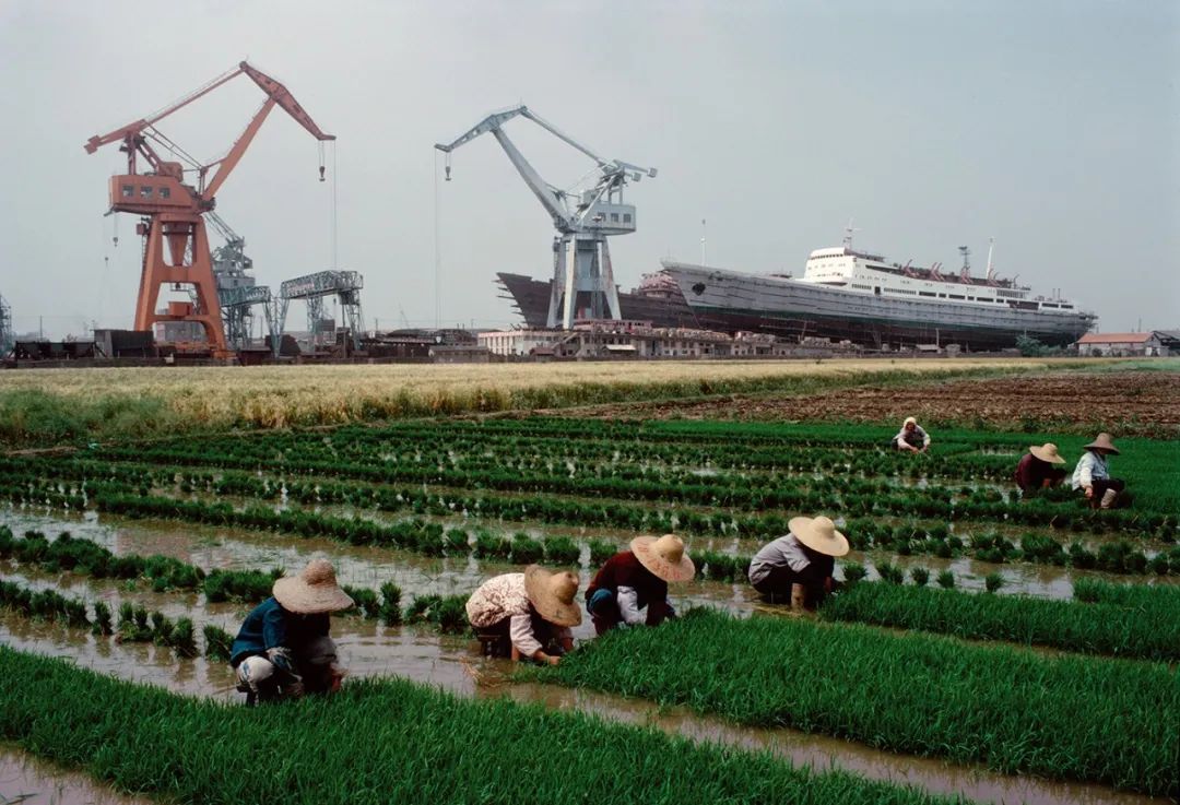 沪东造船厂附近的稻田,一艘八百吨的轮船正在建造中,上海,1980年