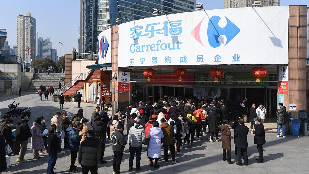 2023年1月29日,长沙,家乐福芙蓉广场店门口,不少持有长沙家乐福购物卡的顾客在排队办理退卡事宜。视觉中国 图
