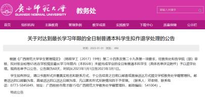 2023年第一天,广西师范大学的65名本科生收到了来自学校的退学通知。根据广西师范大学教务处发布的《关于对达到最长学习年限的全日制普通本科学生拟作退学处理的公告》,拟对这些在学校规定最长学习年限内(本科6年)未能完成学业的全日制普通本科生予以退学处理。