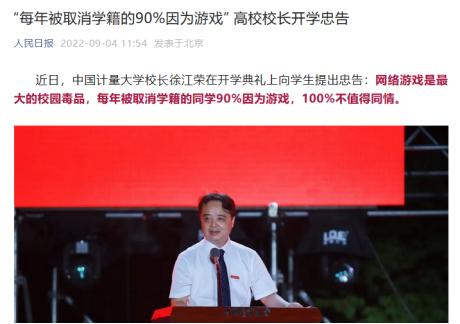 就现实情况而言,不少同学进入大学校园后过分地放松自己,沉迷于与学习无关的事情之中,荒废了学业,导致未能在规定的时间内通过课程考核,最终无法毕业。中国计量大学校长徐江荣在2022级新生开学典礼的发言中就提到:“每年被取消学籍的同学90%因为游戏。”