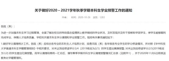 华中科技大学在学业预警和淘汰机制中,对未达到应修读学分3/4(大二为2/3)的学生提出黄牌预警, 对未达到应修读学分2/3(大二为1/2)的学生提出红牌预警。受到红、黄牌学业预警的学生将通知学生本人及家长,同时,各学院教务部门制定帮扶措施,帮助学生顺利完成学业。若仍然无法达到学分要求,则从本科转入专科。