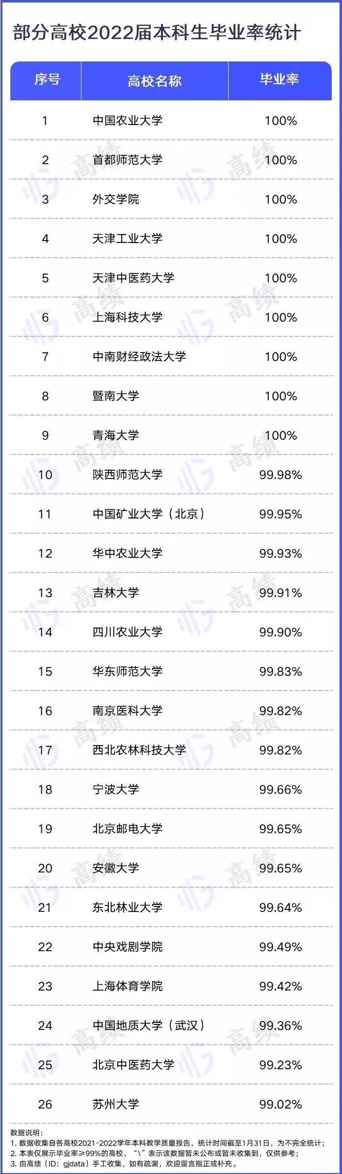 其中,中国农业大学、首都师范大学、外交学院、天津工业大学、天津中医药大学、上海科技大学、中南财经政法大学、暨南大学和青海大学这9所高校的毕业率达到了100%,实现了全员毕业!