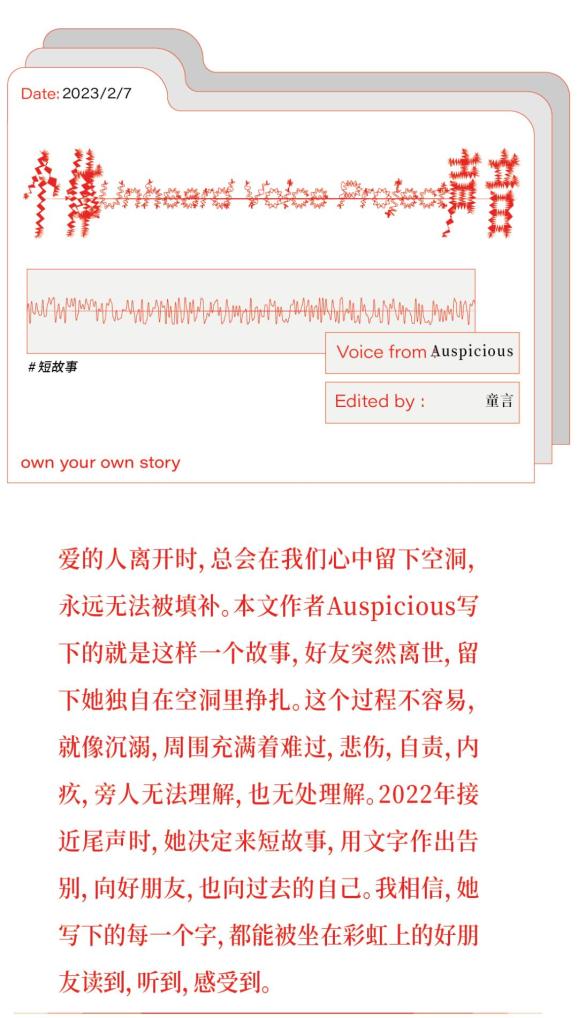 参加短故事是年末一次很仓促的决定,也是我很庆幸自己做出的决定。我从停滞的博士研究当中给自己放了一个长假,停下来审视一件过去一年里发生在我人生中的一个重要事件。朋友Angelina的自杀在很长一段时间里是我的梦魇,这件事改变了我看待世界的方式,也影响了我所有的人际关系。这次写作是我第一次正视Angelina去世的事实,接受这件事对我自己、对我的生活的影响,以及更重要的,如何面对没有Angelina的,我接下来的人生。透过这次写作,我看到了自己,也看到了他人。这次写作也让我意识到,我虽然不再是从前的我,但我依然在被很多人爱着,而且我的内核依然是一个愿意去相信的理想主义者。在2022年的年末,我终于和Angelina好好地告别,踏上我接下来的旅途。