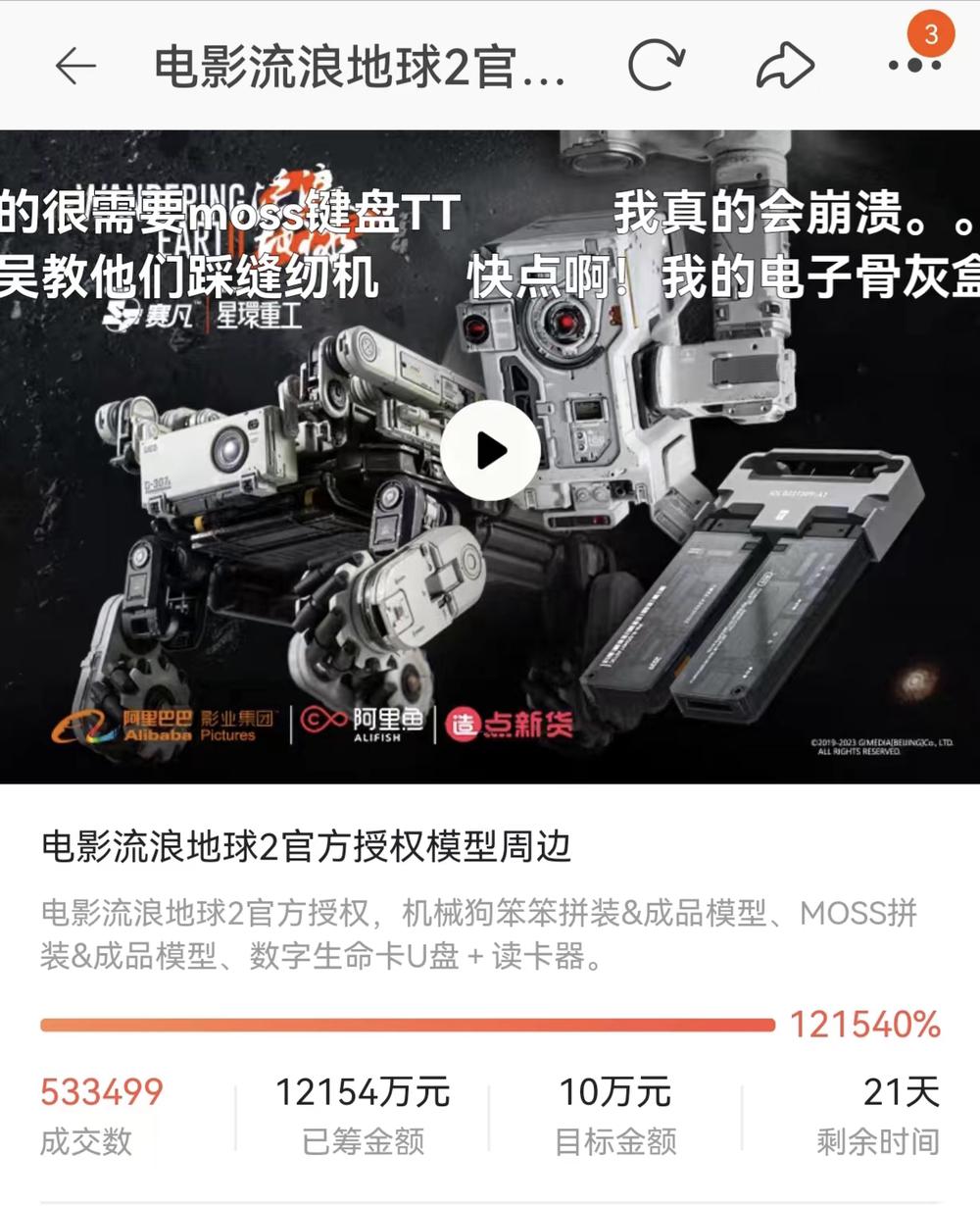 短短11天,原定目标10万元的《流浪地球2》官方周边众筹项目达成率超过1200倍。发起众筹的商家都被这突如其来的“饱和式众筹”吓懵了,不得不提前宣布售罄停档。