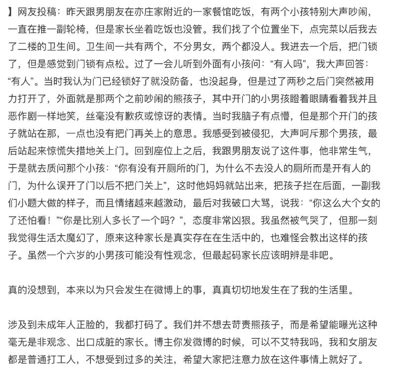 图源:新浪微博人们不能理解为什么明明有父亲在场、有无障碍卫生间,这个6岁小男孩还会出现在女卫生间。
