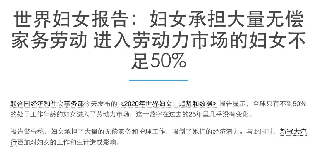《2020年世界妇女:趋势和数据》显示全球女性每天花费在无偿家务和护理工作上的时间是男性的三倍,约为4.2小时。