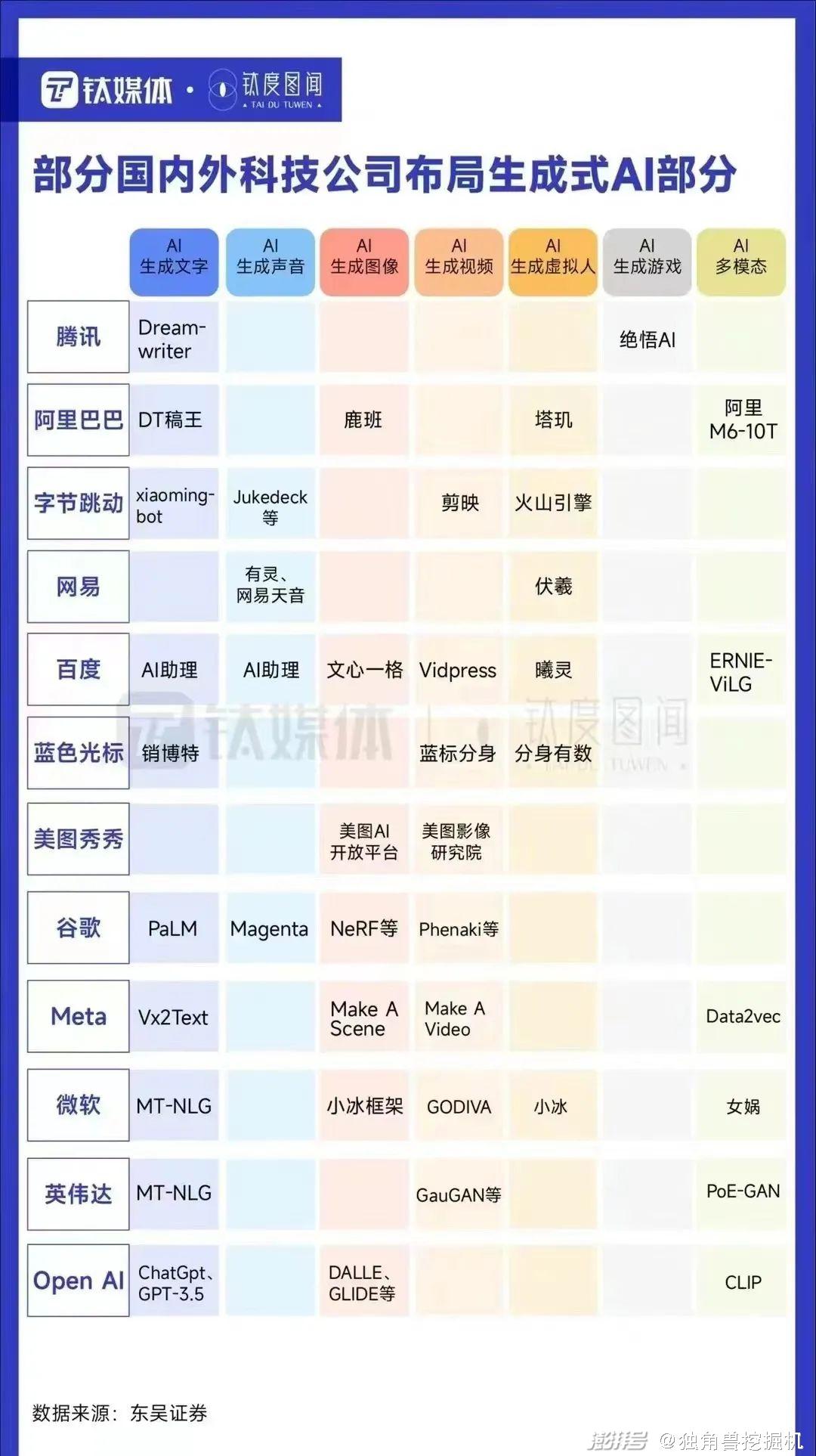 就算力、算法、算据三大要素来说,百度、华为、阿里、腾讯、字节、网易等科技企业都有能力推出类ChatGPT产品,但从文字、声音、图像、视频、虚拟人、游戏和多模态等生成式AI的细分领域来看,百度和阿里的根基相对更深。