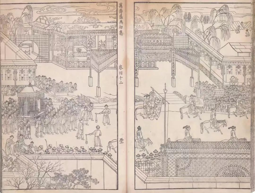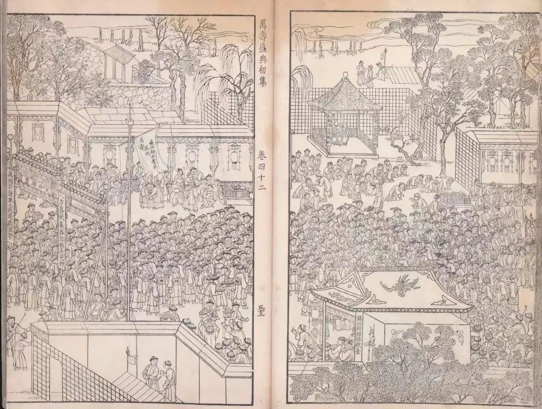 康熙年间的绢本《万寿盛典图》现已下落不明,武英殿刻本《万寿盛典图》第四十一、四十二卷木刻画成为最接近当时场景的历史长卷