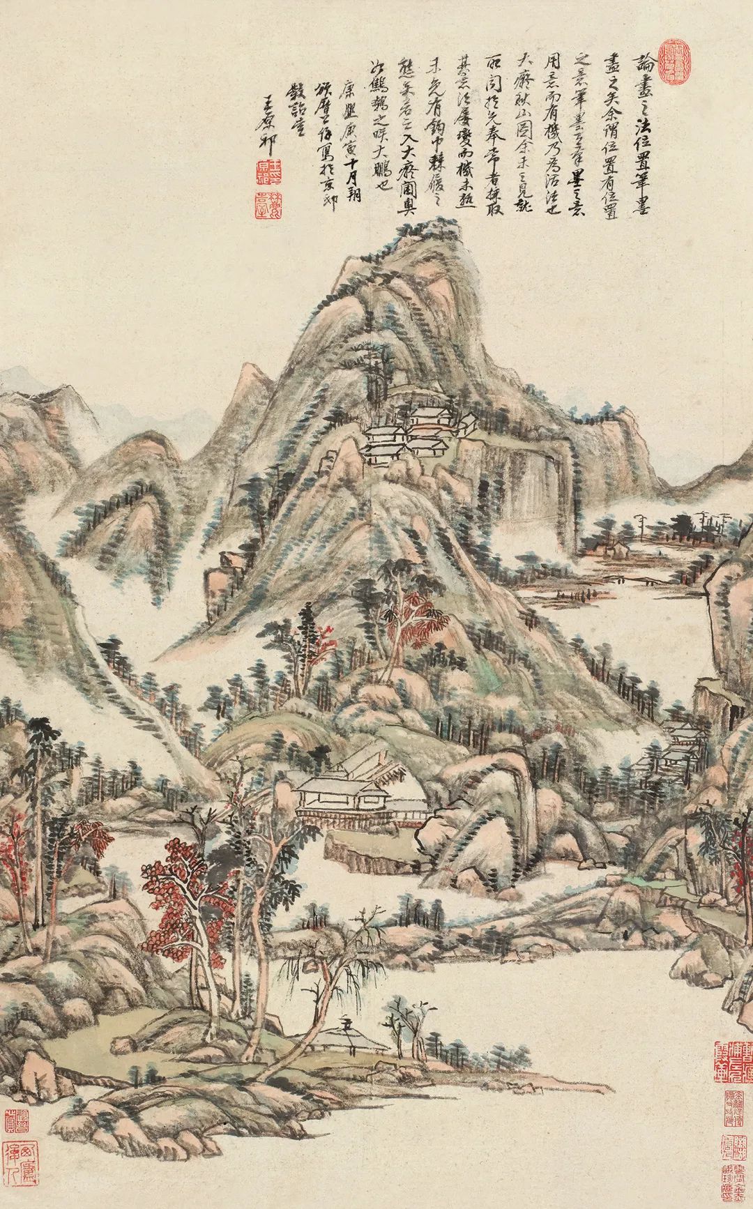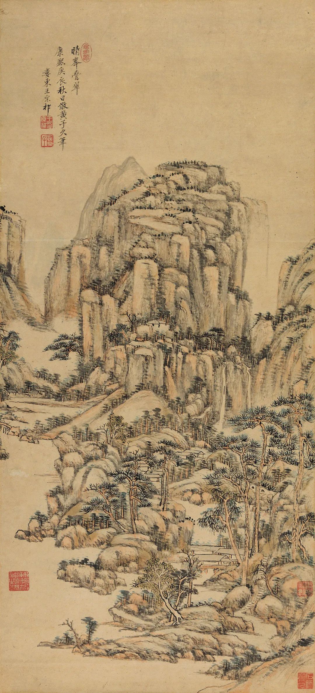 此作题识:晴峰叠翠。康熙庚辰秋日,仿黄子久笔。娄东王原祁。