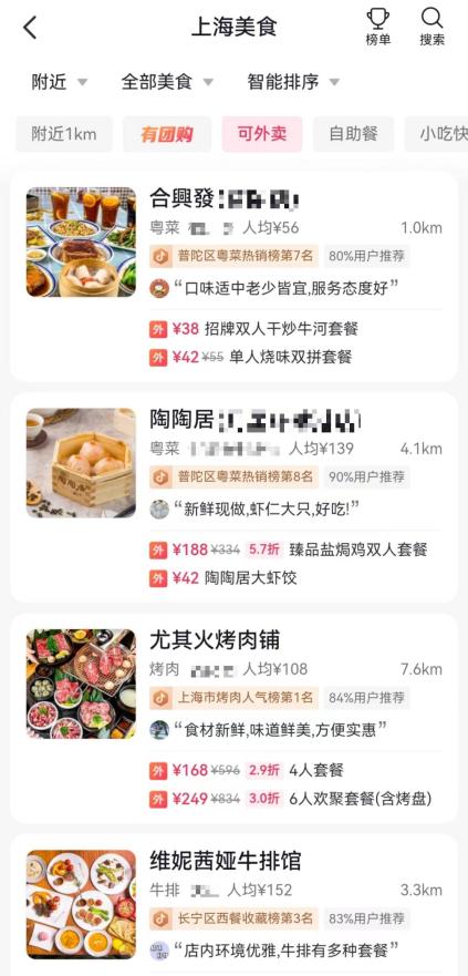 饿了么外卖界面与其他两位外卖“元老”最大的区别是,抖音以团购配送为主,可供用户自由点单的菜品寥寥无几,大多只能买团购套餐。
