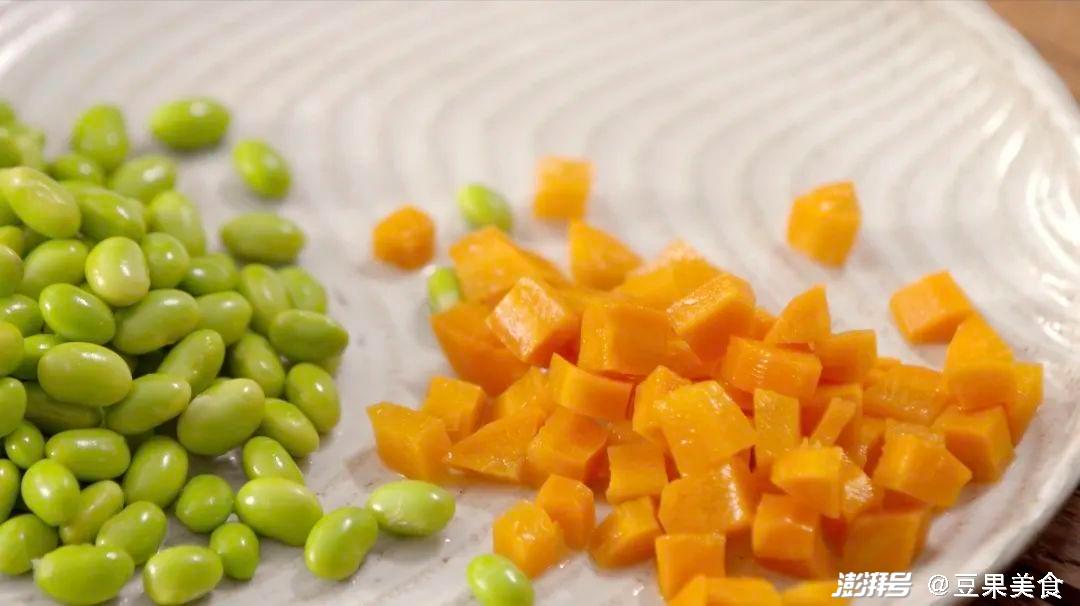 3.毛豆、胡萝卜分别放入沸水中焯至浮起虾仁入沸水后关火,加料酒和盐,焯水至断生