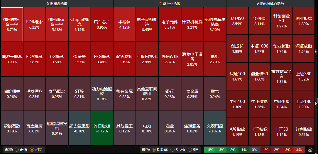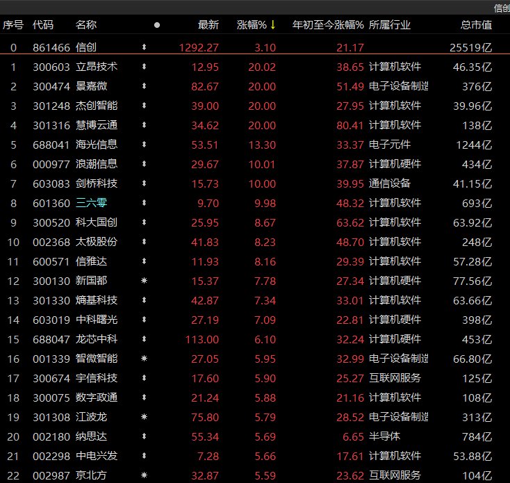信创概念大涨3%,立昂技术、景嘉微、杰创智能、慧博云通均“20CM”涨停。金山办公、中兴通讯、海光信息均表现不错。