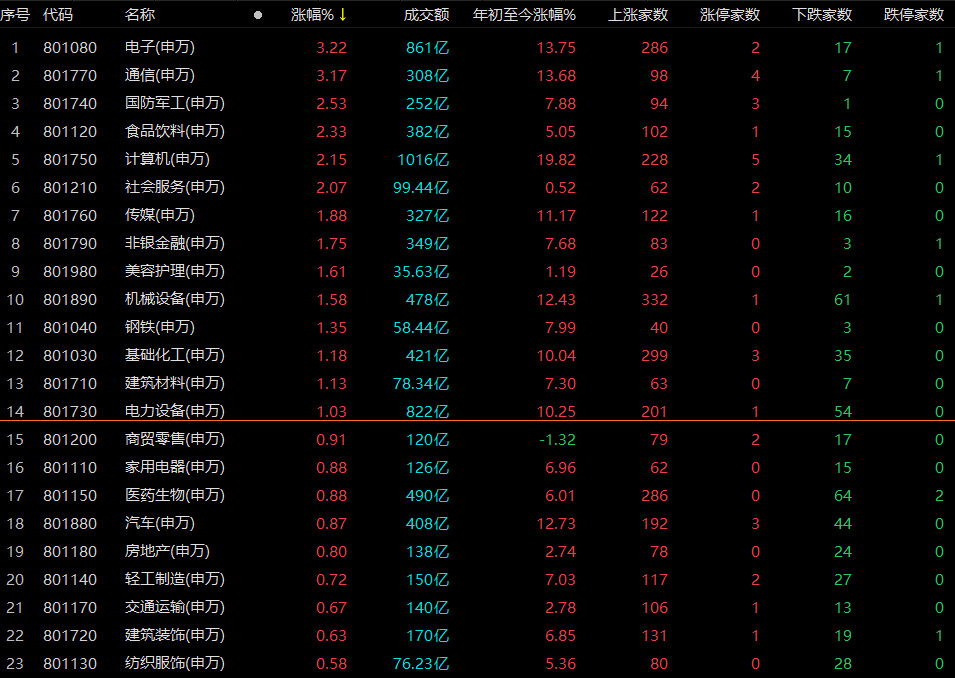 31个申万一级行业全部飘红,电子、通信、国防军工涨约3%,食品饮料、计算机、社会服务、传媒、非银金融板块涨约2%。