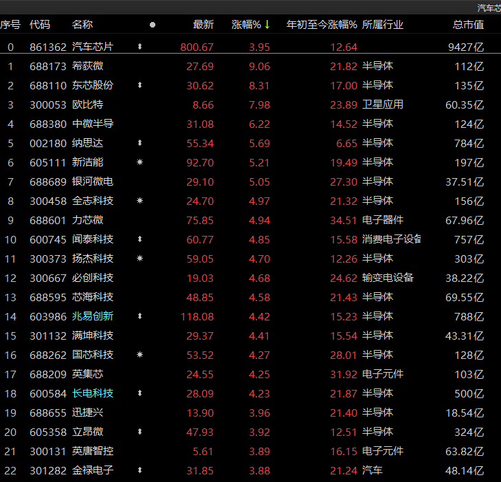 汽车芯片概念涨约4%,银河微电、新洁能等7只个股涨幅超过5%,韦尔股份、紫光国微均涨逾3%。