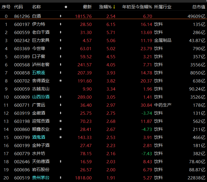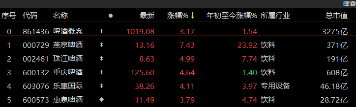 白酒、啤酒概念涨势不错,燕京啤酒涨幅超过7%,五粮液、泸州老窖涨约4%,贵州茅台收涨1.91%报1818元/股。