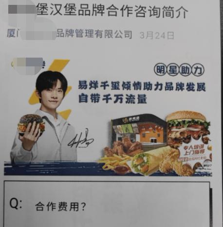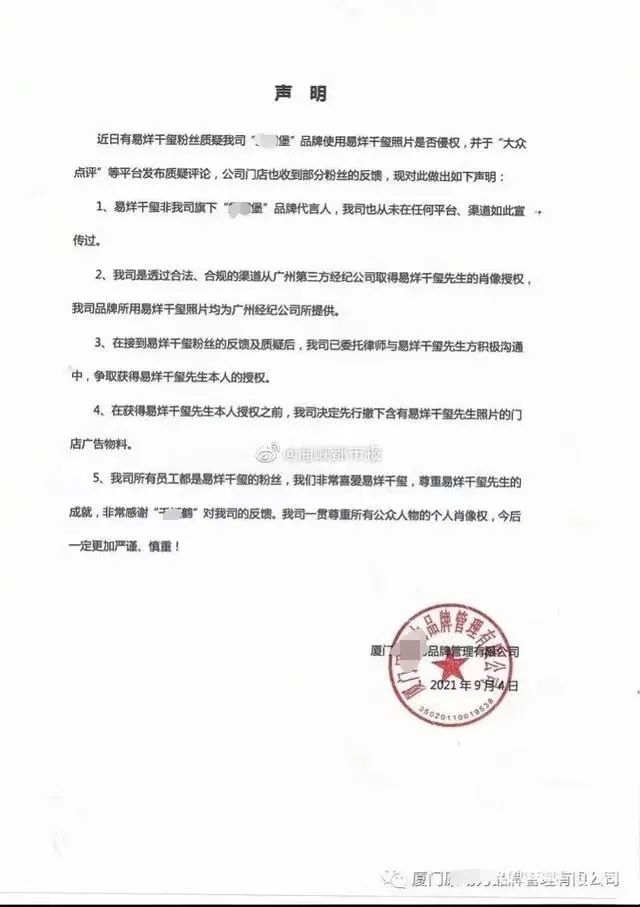 2021年9月,接到了法院传票后,厦门某品牌管理有限公司在其公众号上发布声明称,易烊千玺并非XX堡代言人,使用的照片都是经过广州第三方经纪公司的授权。