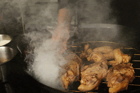 东北熏鸡架,开锅后烟雾缭绕。图/网络