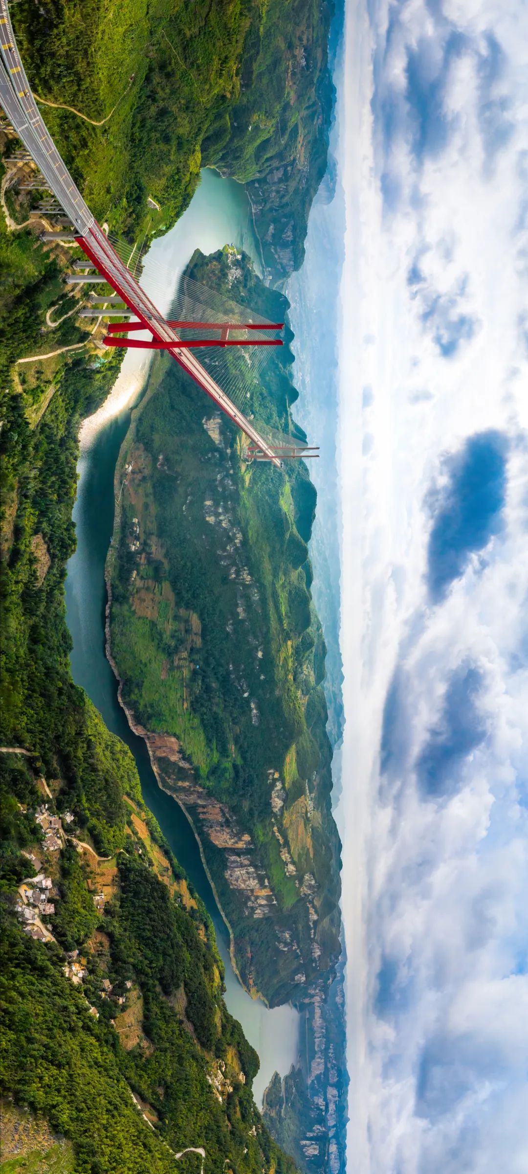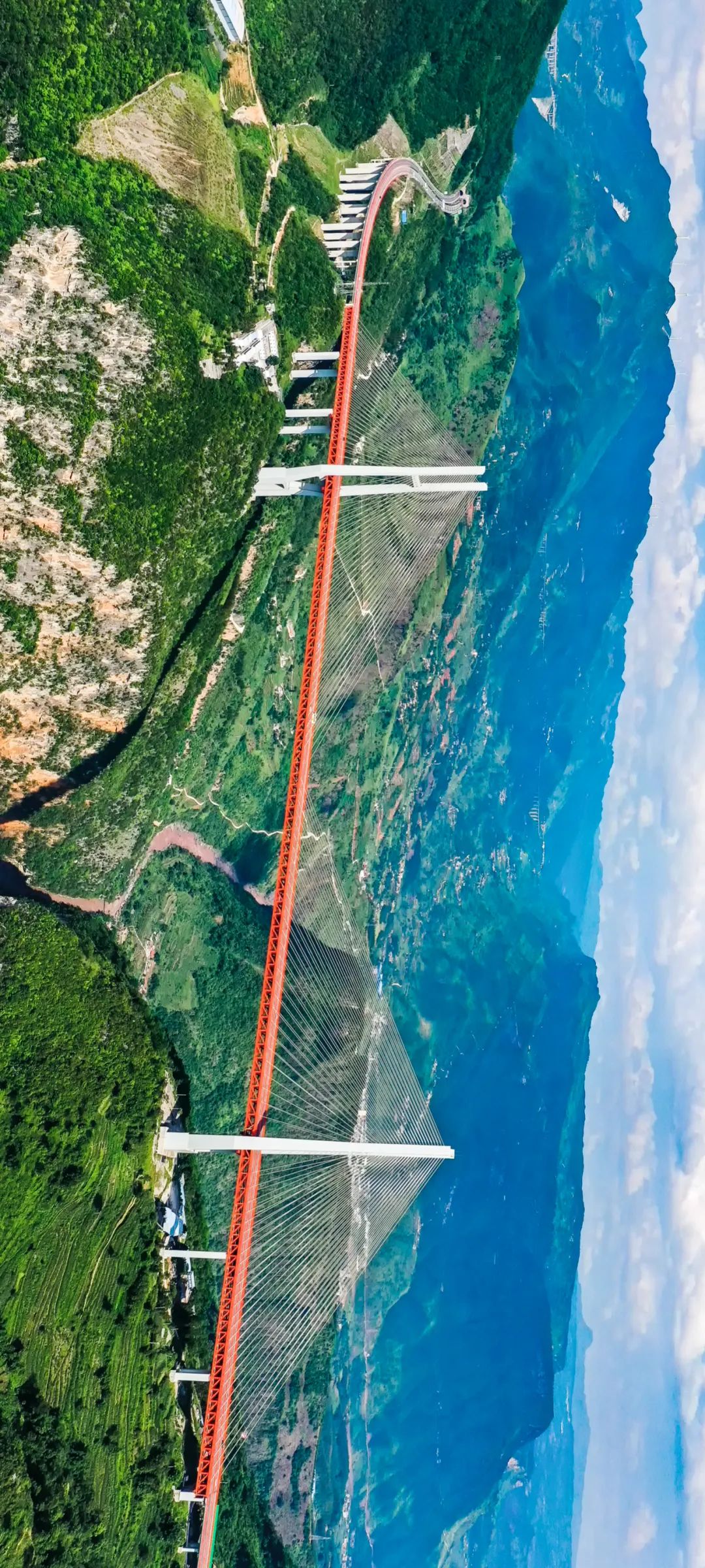 崇山峻岭如绿色的城堡,一条红色巨龙般的斜拉桥横亘其间,灰色的桥墩如巨型的龙爪嵌入大地,一道道斜拉索犹如硕大无朋的翅膀,穿透了山间的云雾,遮蔽了周围的天空。这是位于杭瑞高速公路毕节至都格段上的北盘江大桥。这座全长1341.4米的斜拉桥,桥面距离下方奔流的江面565.4米,相当于200层楼高,被吉尼斯世界纪录认证为世界第一高桥。
