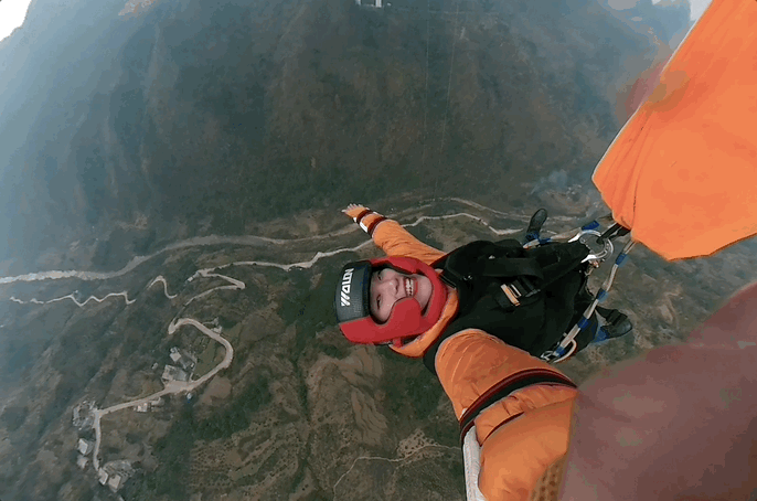站在红色的桥桁上,身上背着低空跳伞包,山风在耳边呼啸,坝陵河在下面像一条银色的丝带,距离下方的地面约370米,100多层楼的高度人目眩,纵身一跃,在空中尽情翻滚呼吸,这就是坝陵河大桥的低空跳伞。