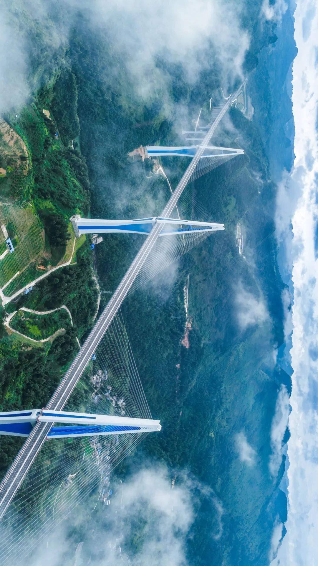 位于平塘至罗甸高速公路上的平塘大桥,主桥为三塔双索面叠合梁斜拉桥,桥跨布置为(249.5+550+550+249.5)米,桥梁全长2135米,桥塔采用钻石形空间塔设计,主塔高332米,是世界第一高混凝土桥塔。这么美的桥也一定要有绝美的观测点。“天空之桥”观光服务区能满足你所有想象。