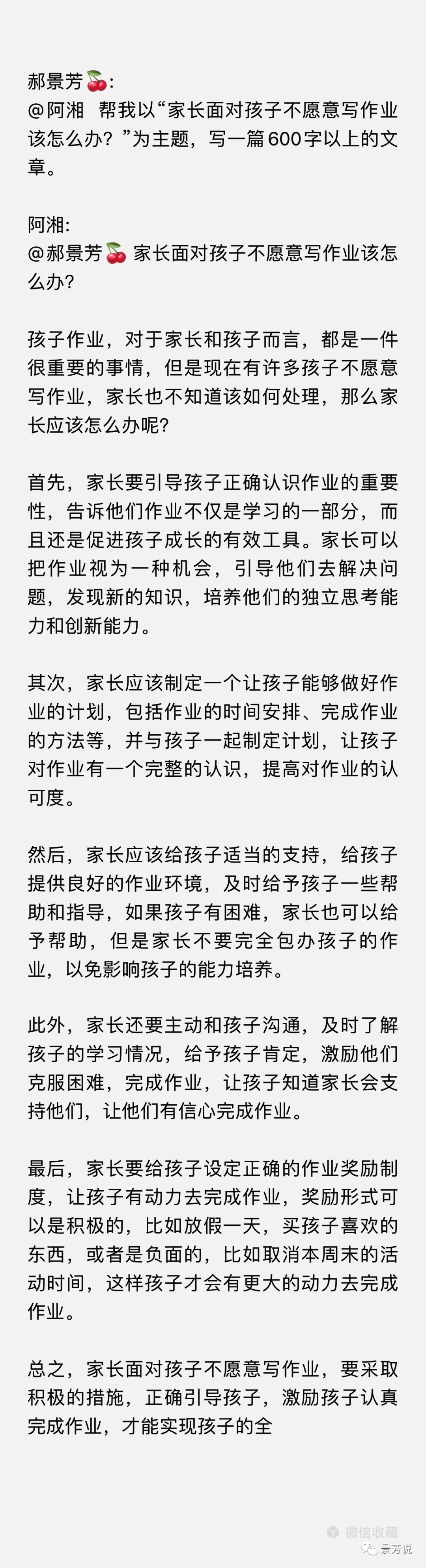 于是我又想,那是不是可以替我写教育类的文章了呢?我于是让它写了篇文章:《家长面对孩子不想写作业该怎么办》,不少于600字。