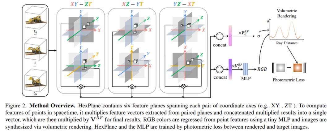 研究者采用新式的 HexPlane 架构克服了这些挑战。受静态场景因子表征的启发,HexPlane 将一个 4D 时空网格分解为跨越每对坐标轴(例如 XY, ZT)的六个特征平面。HexPlane 通过将一个 4D 时空点投影到每个特征平面上,聚合六个结果特征向量来计算时空点的特征向量。然后将融合的特征向量传递给一个小型 MLP,该 MLP 预测点的颜色;之后可以通过体渲染来渲染新视图。