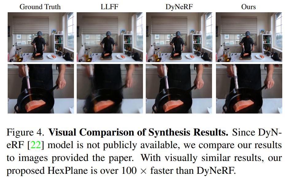 鉴于 DyNeRF 的模型未公开,因此很难直接比较可视化结果。本文从原论文中下载图像,并在检索结果中找到了最匹配的图像,如图 4 所示。