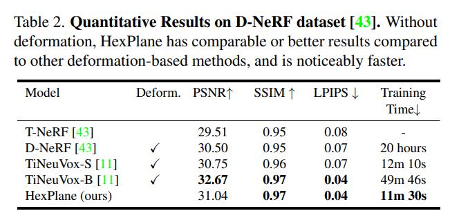 D-NeRF 数据集的定量结果如表 2 所示: