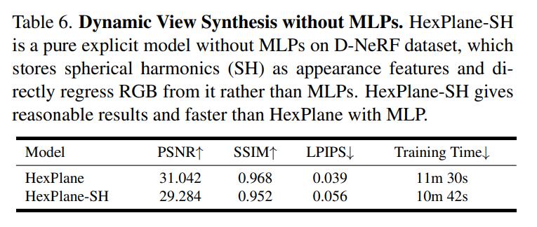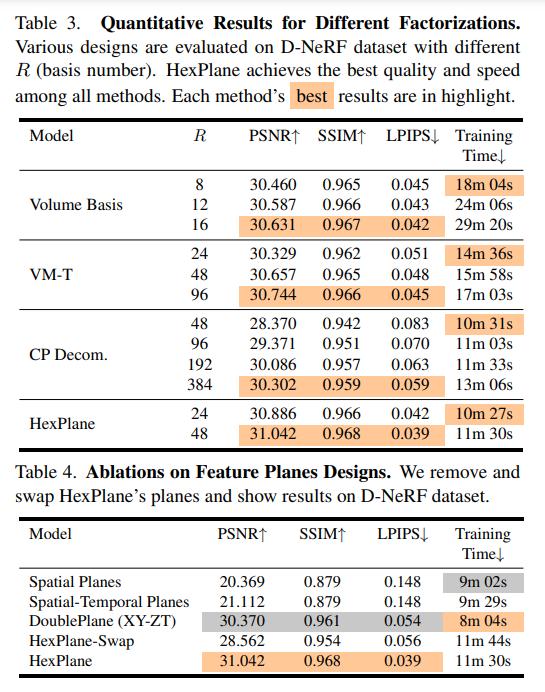 研究者还比较了 HexPlane 与表 3 中方法提到的部分其他设计: