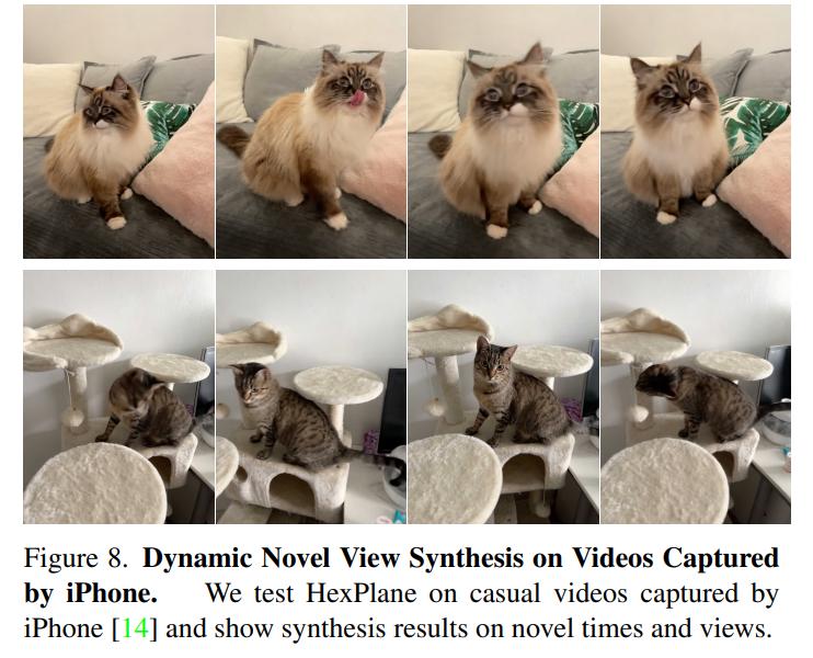 研究者采用 iPhone 拍摄的单目视频来测试 HexPlane,其相对随意的摄像轨迹更接近真实的用例。具体合成结果见图 8。