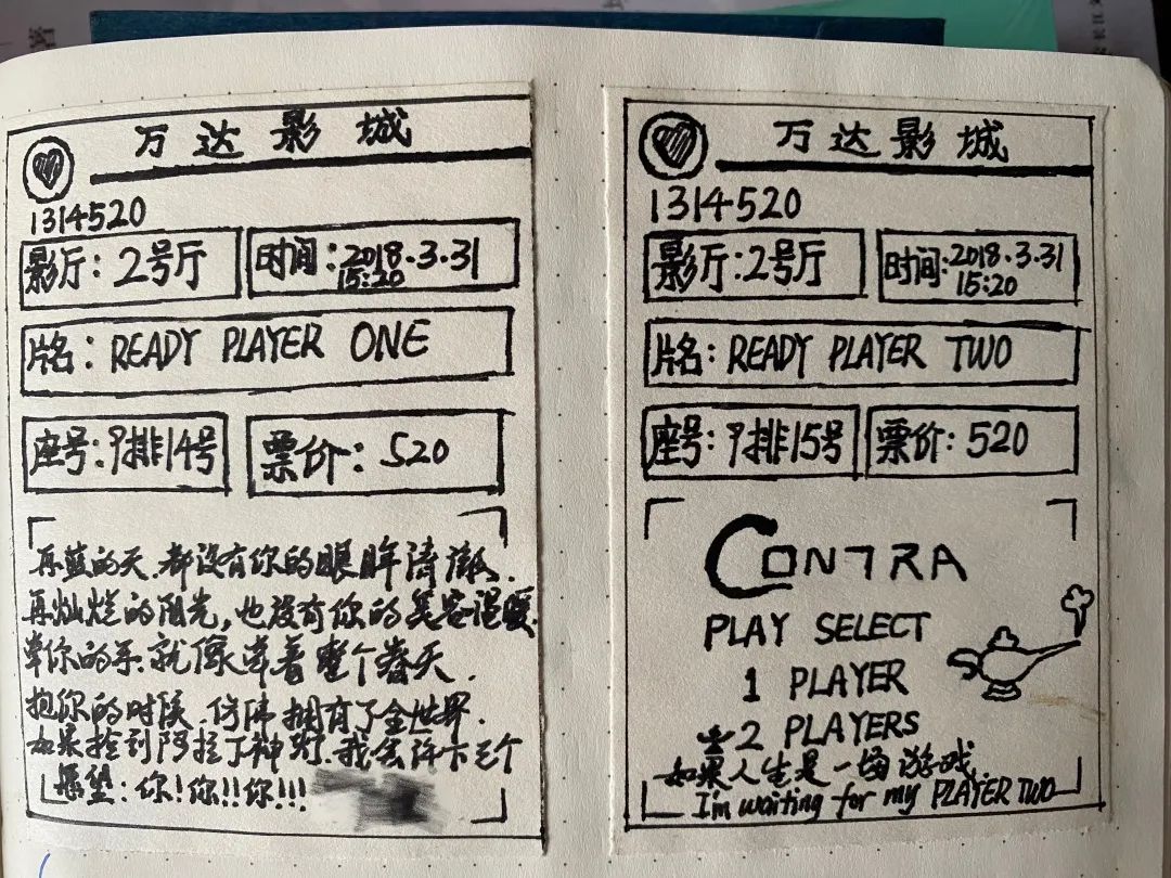 确认关系后,我们看的第一部电影是《头号玩家》,那时我有收集电影票的习惯,可是我却把那天的电影票弄丢了。惊喜的是,为了弥补遗憾,他给我画了两张电影票。在他手里看到它们的瞬间,是可以回忆很久的心动时刻。