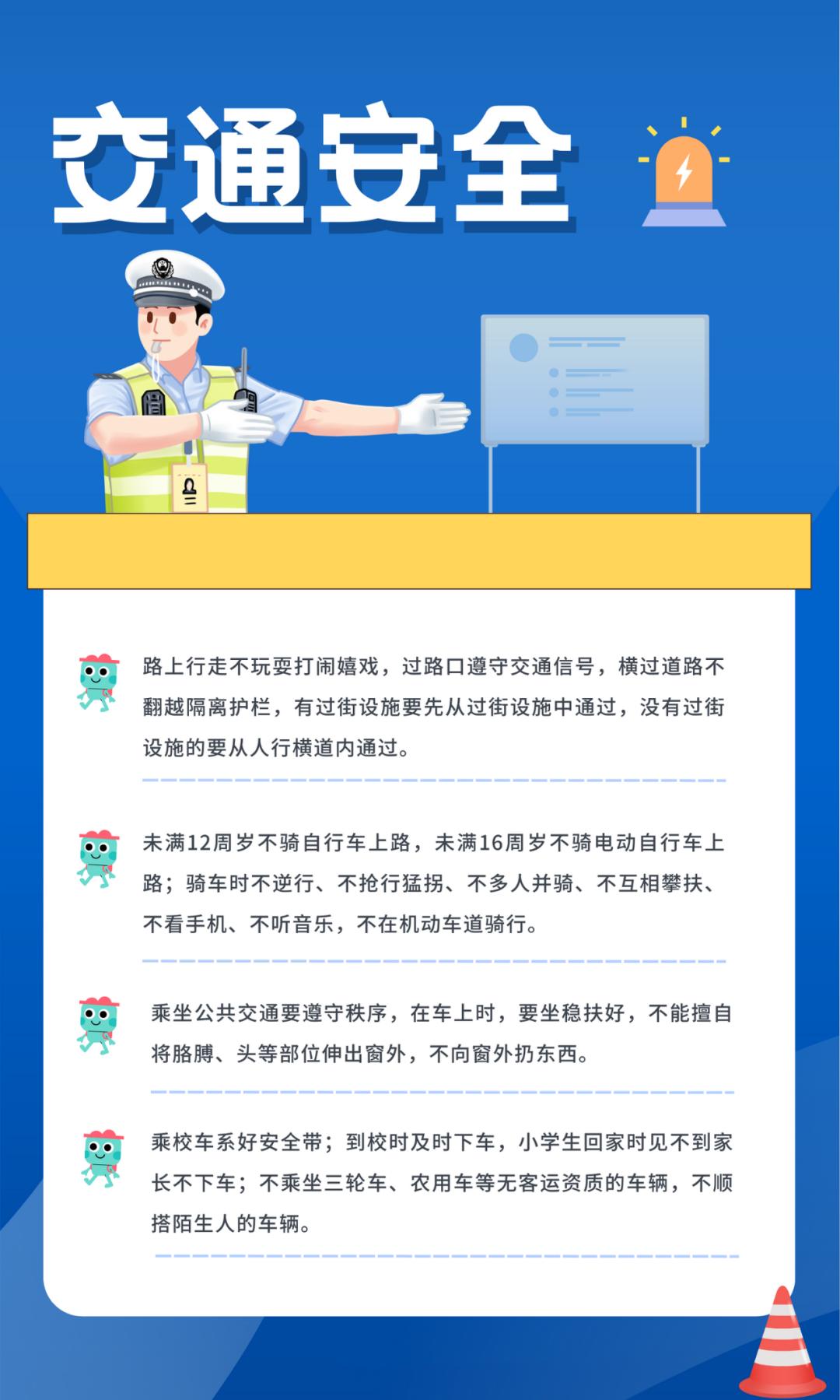 提醒在校学生及家长提前出门,以免排队产生交通拥堵。在学校周边道路要规范停车,禁止停车路段严禁停车,以免加重交通拥堵。在此基础上,学生家长、监护人要加大对学生的交通安全教育,走路要走人行道,过街要走斑马线,不随意斜穿,通过有红绿灯控制的路口按照信号灯指示通行,红灯停、绿灯行;骑行摩托车、电动自行车接送学生时,骑乘人员要按规定佩戴好安全头盔,系好保险扣,电动自行车后座只能搭乘一名12岁以下孩子;驾驶机动车接送学生时,驾乘人员请全程全员规范使用安全带。