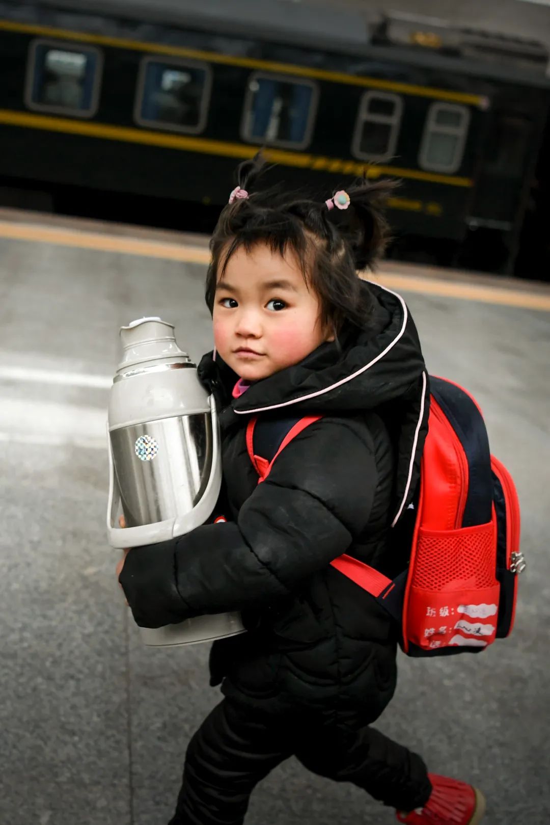 福州,小女孩抱着热水瓶、背着新书包奔向福州开往重庆北的绿皮火车。