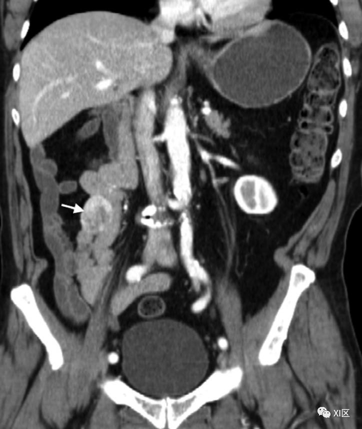 图8 Meckel憩室与异位胃粘膜,31岁男性,消化道出血。冠状位CT小肠造影图像显示盲端充气管状结构,左侧边缘粘膜增厚,增强(箭头,结节由短箭头标识)。锝99高锝酸盐闪烁扫描是调查消化道出血和疑似Meckel憩室的儿科患者的首选方式,灵敏度为85%,特异性为95%,准确度为90%。然而,由于缺乏异位胃粘膜,成人的敏感性和准确性分别下降到63%和46%。