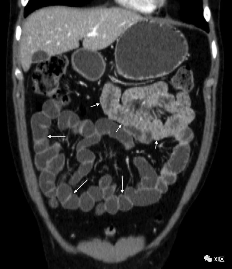 肠道不同程度的造影剂增强是一个主要标志