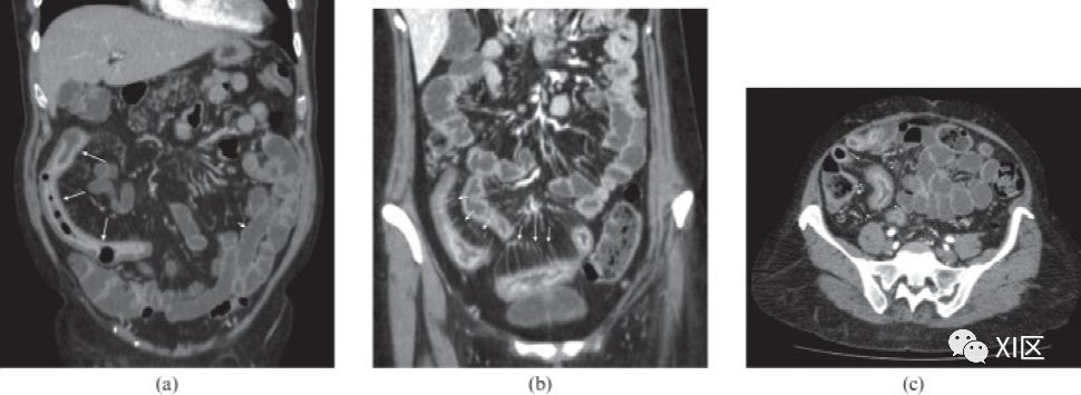 图5 不同类型的肠壁分层。(a)一名新诊断为活动性克罗恩病的34岁男性回肠末端软组织密度壁增厚,代表炎症浸润。(b)62岁复发性克罗恩病女性回肠远端液体密度壁增厚,代表粘膜下水肿。(c)62岁女性回肠末端脂肪密度壁增厚,代表慢性活动性炎症。克罗恩病主要累及小肠的肠系膜边界,经常导致不对称炎症和纤维化,并伴有反肠系膜边界的假性囊状突起。狭窄前扩张有助于确定、定位和评估狭窄的功能意义。活动性炎症与肠系膜血管(直肠血管)的扩张和充血有关,这些血管垂直于肠腔穿透肠壁,形成所谓的“梳状征”(图4b)。然而,这一迹象在日常临床实践中的有用性值得商榷。例如,Koh等人的一项使用MRI的研究表明,肠系膜血管的增加在诊断活动性克罗恩病时具有78%的敏感性和57%的特异性。