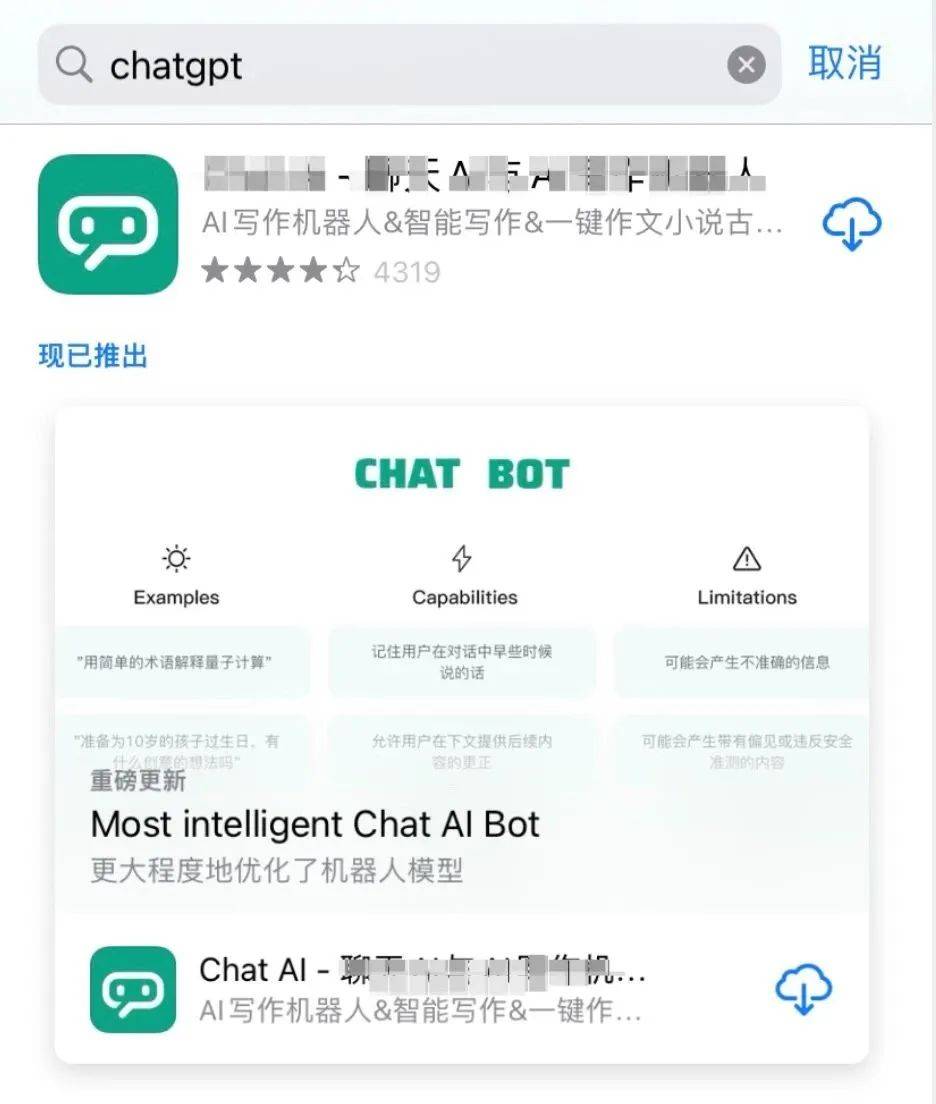 与此同时,在手机应用商店,目前还有大量的“李鬼”APP蹭着ChatGPT的热度在继续“收割”。