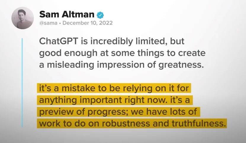 正如OpenAI CEO山姆·柯曼所说:“ChatGPT有着令人难以置信的局限性,在某些事情上它已经做得很出色,以至于给人一种它很强大的错觉。现在做任何重要的事情都依赖它是错误的,这只是为科技进步提供了一个预览,我们在真实性和稳定性方面还有很多工作要做。”