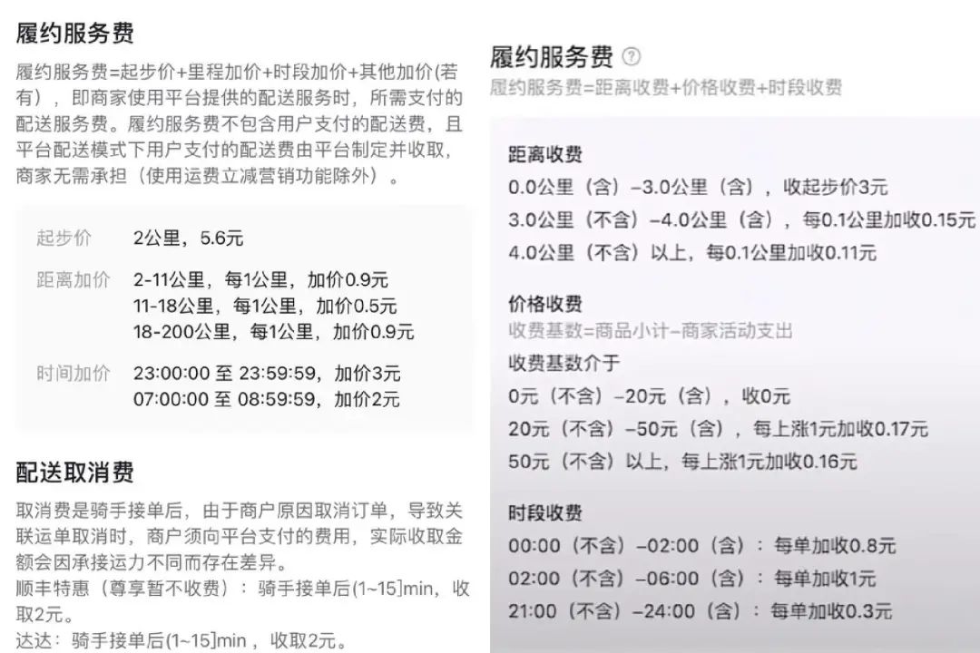 图说:左图为抖音外卖履约服务费机制,右图为美团外卖履约服务费机制。Tech星球对比发现,若是配送一份客单价为20元,距离3公里的订单,抖音外卖的配送费需要6.5元,而美团需要3元。但若是配送一份客单价为50元,距离5公里的订单,抖音外卖需要配送费7.4元,而美团外卖则需要10.3元。