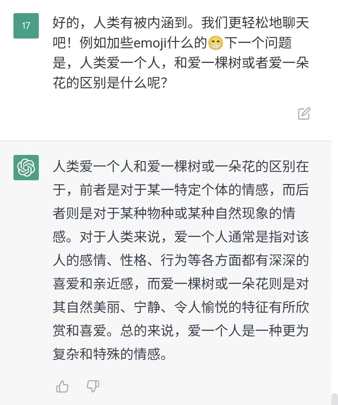 刺猬公社:好的,人类有被内涵到。我们更轻松地聊天吧!例如加些emoji什么的。下一个问题是,人类爱一个人,和爱一棵树或者爱一朵花的区别是什么呢?
