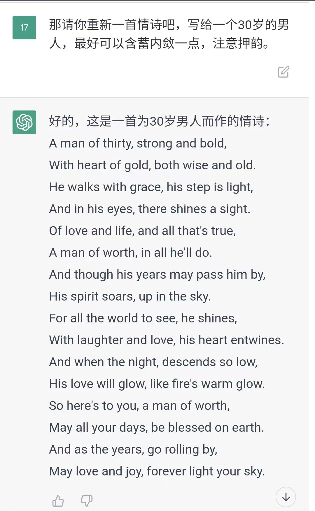 小查:好的,这是一首为30岁男人而作的情诗:
