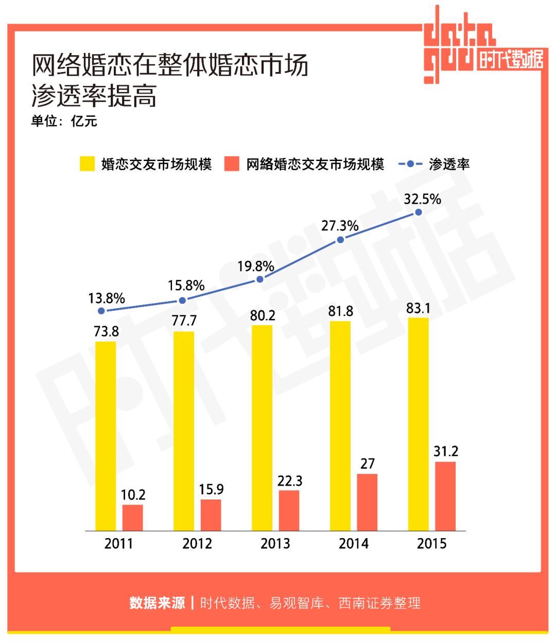 人们开始学习在互联网上寻找伴侣,网络婚恋交友行业迎来快速发展期。易观智库的数据显示,2015年,网络婚恋市场规模为 27亿元,五年内翻了一倍,渗透率为 32.5%,较2011年增长了18.7%。