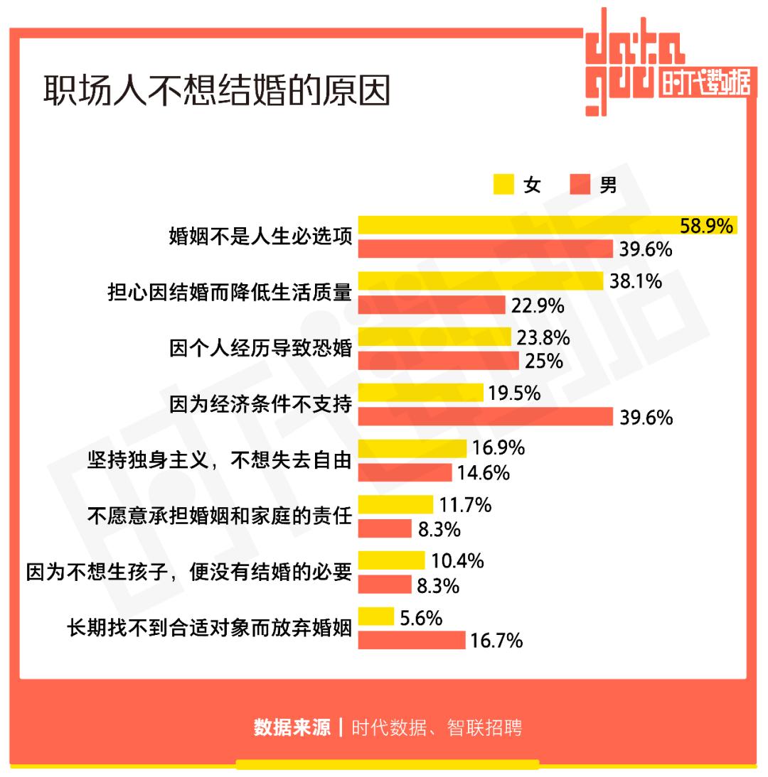 随着经济环境与家庭观念的变化,婚姻不再是生活必需品,而是一种选择。《非诚勿扰》这类电视相亲节目逐渐离开舞台中心。智联招聘发布的《2021中国女性职场现状调查报告》显示,关于未婚职场人不打算结婚的原因,58.9%的女性受访者表示“婚姻不是必选项”。