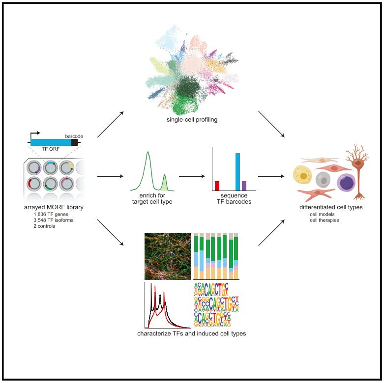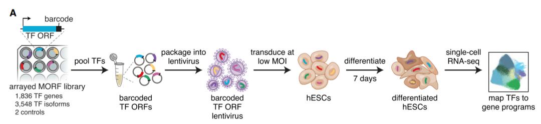 该研究创建了一个涵盖了人类所有转录因子异构亚型(共3548个)的条形码文库,并将其用于构建转录因子图谱(TF Atlas),以单细胞分辨率绘制了每个转录因子过表达在人类胚胎干细胞(hESCs)中引起的表达谱变化。
