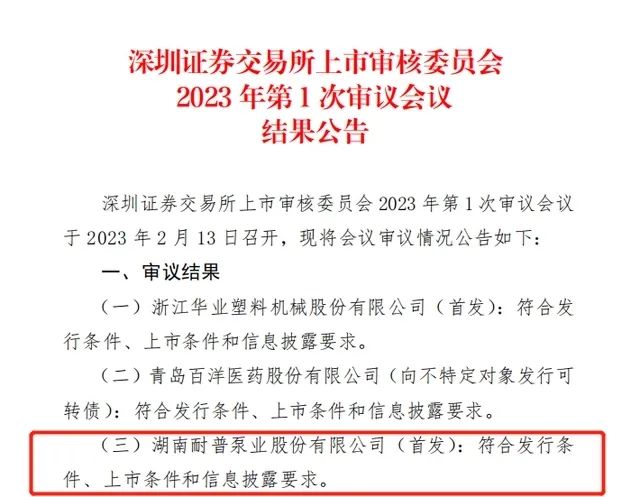 2月13日,深圳证券交易所上市审核委员会召开2023年第1次审议会议,湖南耐普泵业股份有限公司(以下简称“耐普股份”)(首发)符合发行条件、上市条件和信息披露要求,成功过会。